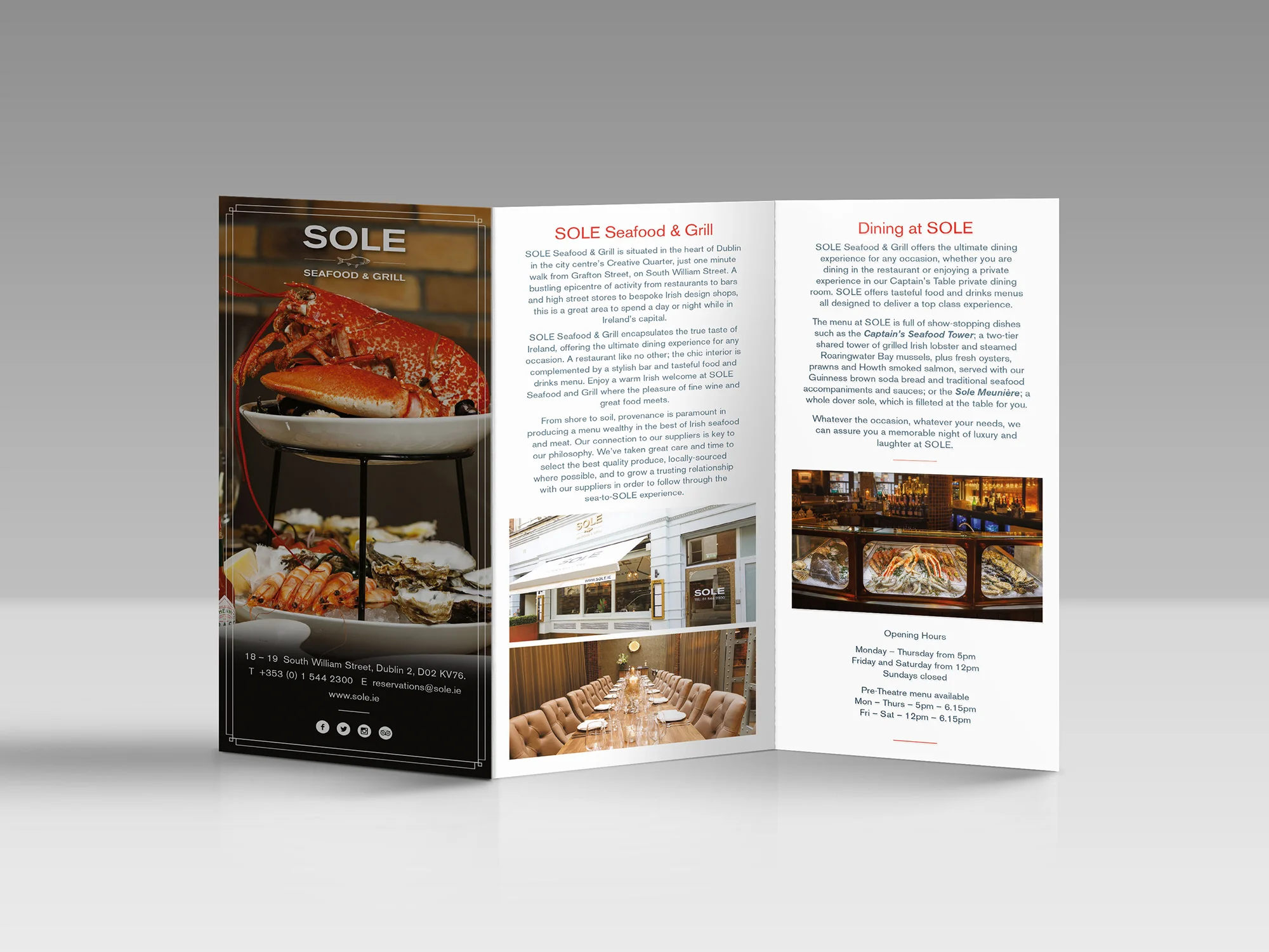 Scapegoat Design created a logo that is elegant, yet flexible enough to work across a range of marketing collateral. We also produced the accompanying brand guidelines which outline how the logo should be optimally used in each and every situation. From this the logo was applied to exterior signage and branding, menus, stationery, press advertising, a website and so on. Sole restaurant is now a well-established brand in terms of city centre dining and continues to go from strength to strength.